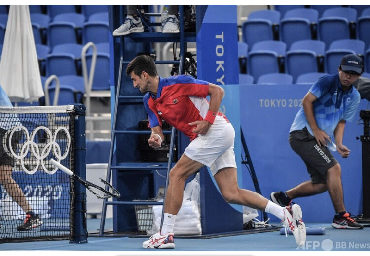 第3セットの最初のゲームで、ジョコ*はブレークチャンスをふいにすると、空席のスタンドにラケットを放り投げ、その後もいら立ちを抑えることができず、ネット際でミスをするとほかのラケットも破壊した。
